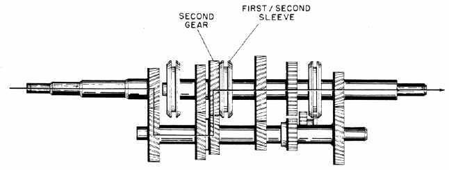When the shift lever is placed in second position, the first/second sleeve is disengaged from first gear, then engaged with second gear. Synchronizing is the same as for first gear.