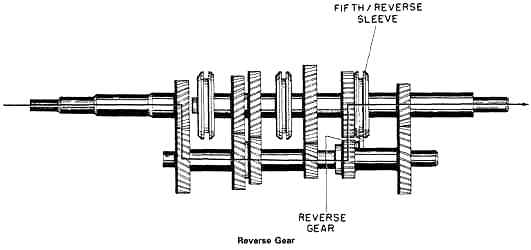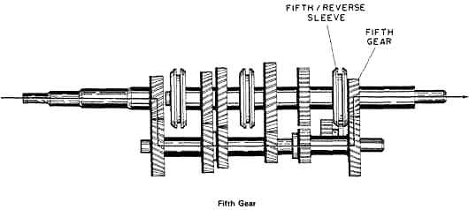 To go from fourth to fifth gear, the shift lover is returned to neutral to disengage the third/fourth sleeve from the input shaft. It is then moved to fifth position. The fifth/reverse position sleeve engages the fifth gear.