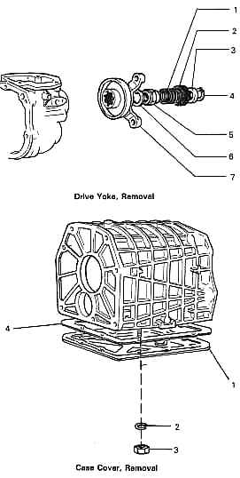 Remove Yoke a. Remove snap ring (4), spacer (3), seal (2), and spring (1) from output shaft. b. Using adapter A-55130 on yoke (7), remove nut (5) and washer (6). c. Using a puller, remove yoke (7). 1. Spring |