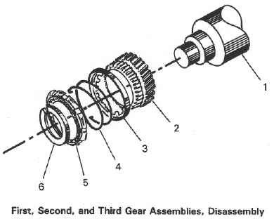 Disassemble First, Second, and Third Gear Assemblies NOTE: Although different in size, the first, second, and third gear assemblies are similar in assembly. Also, the third gear assembly is assembled on the main shaft. a. Using tool A.701 59, remove snap ring