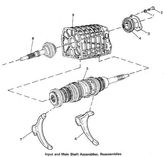 Reassemble Transmission Assembly - Install Input and Main Shaft Assemblies a. Lightly coat all bearing bores, bores for fork shafts, and bores for detent balls and dowels. Also coat each part as it is installed. b. While keeping main shaft assembly (5) fully compressed, carefully insert output end into its bore in case (9), then insert input end. c. Check for bearing in input shaft assembly (8), then carefully work input shaft assembly into its bore in case (9). d. Assemble bearing (4), bearing retainer (3), washers (1) and screws (2). Tighten screws with an im-pact driver. e. Check that input and main shaft assemblies (8 and 5) are easily turned. Check that sleeves on main shaft assembly can be moved axially. f. Install first and second shift fork (6) and third and fourth shift fork (7) in their respective sleeves on main shaft assembly (5). Make sure thread holes face cover end of case (9).