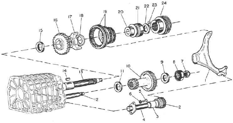 17. Hub 18. Spacer 19. Fifth gear assembly 20. Bushing 21. Bearing 22. Spacer 23. Ball 24. Speedometer drive gear |