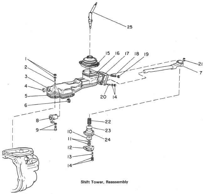 lockwasher 2. Stud 3. Shift tower 4. Cap 5. Gasket 6. Bearing 7. Shaft 8. Dog 9. Bolt and lockwasher |
