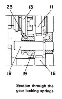 Section facing reverse gearshaft and cogs Section through the gear locking springs