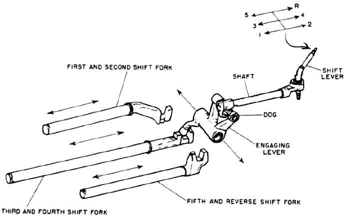 When the driver moves the shift lever from side to side, the shaft in the shift tower is rotated about its axis. The dog at the front end of the shaft contacts the engaging lever and moves it from side to side. The knob on the engaging lever is then moved to one of the three shift forks. Once the shift fork is selected, the shift lever is moved either forward or backward, causing the fork shaft to move forward or backward.