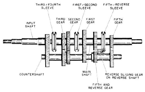 Each pair of mating gears (first/second and third/fourth) on the main shaft share a sleeve that is keyed to and turns with the main shaft. Between the sleeve and each gear is a synchro used to synchronize sleeve and gear speeds for easy engagement. Each sleeve has inner teeth that engage with crown teeth machined on the forward gears. In neutral position, all three sleeves are disengaged from the forward or reverse gears. With no sleeves engaged, all gears are free wheeling. Only the reverse sliding gear does not turn.